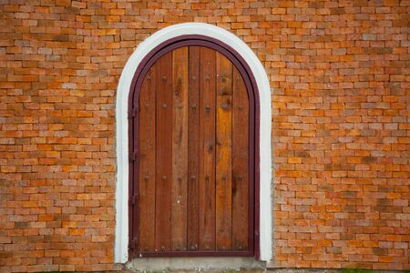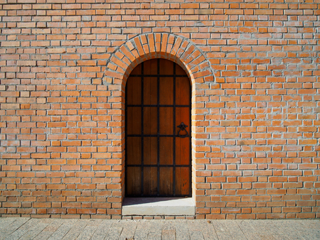 Serbian orthodox church entrance door with vintage ornament decoration surrounded by clinker brick wall with copy space