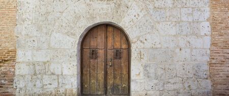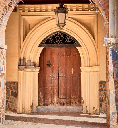 Old entrance door, with gothic arch and wooden gate with cast iron and sculpted iron knocker