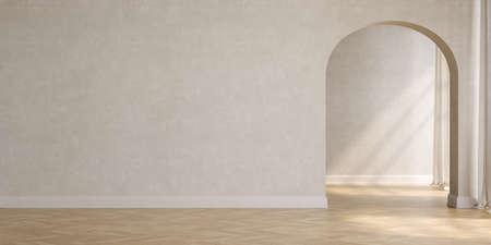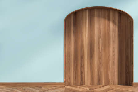 Gallery room interior, bright hall in apartment with wooden floor and arch door. Copy space blank wooden and blue wall, 3D rendering