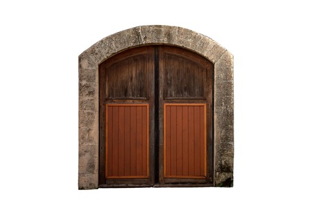 Wooden door in an old Italian house, isolated on white background, clipping path. Black and white.