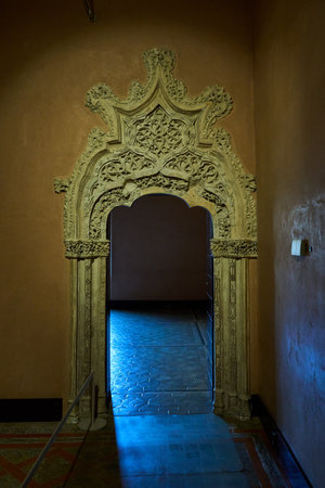 Ancient russian architecture. Close-up of arched metal door in russian style