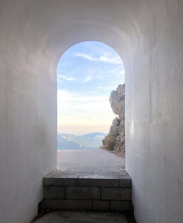 Door to Heaven. Arched passage open to heaven`s sky. Light at end of the tunnel. Hope metaphor.