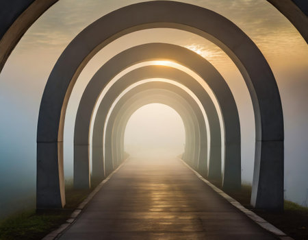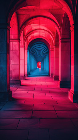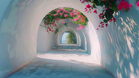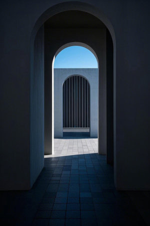 Arched corridor in a minimalist architectural style, the corridor is composed of a series of.
