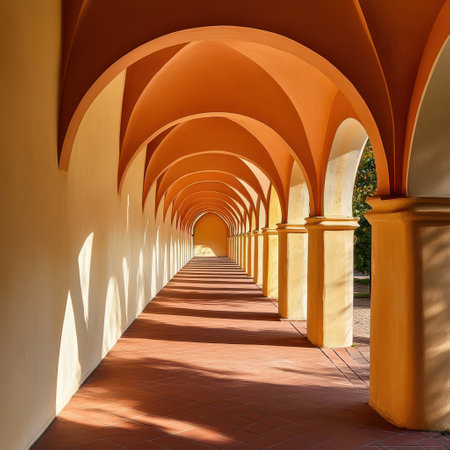 The walkway features graceful arches illuminated by sunlight creating long shadows on the warm tile floor in a serene setting.