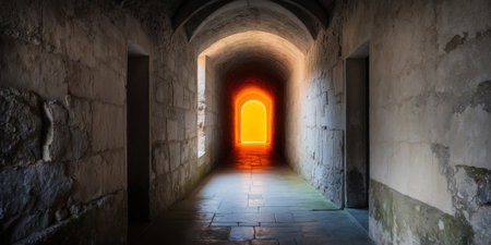 Sunlight is illuminating the end of an ancient stone archway corridor
