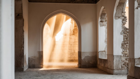 Sun rays shining through arches in a hallway, creating a dramatic light effect, Explore the use of negative space to play with light and shadow in your composition