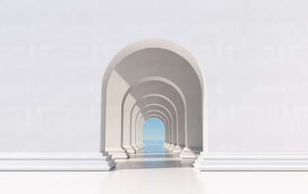 3d rendering. Arch hallway simple geometric background, architectural corridor, portal, arch columns inside empty wall. Modern minimal concept