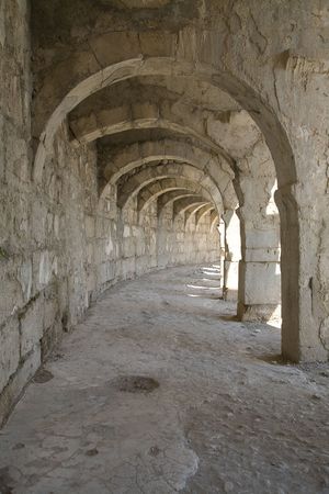 Arches showing endless arches of stone in a sunlit corridor with dramatic shadows keywords: architecture, arch, arcade, corridor, building, stone,...