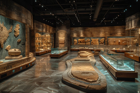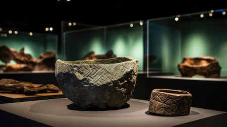 A spacious museum exhibit showcases archaeological finds with rich textures against a backdrop of stone walls, illuminated under soft lighting, invoking the depth of historical discovery. A.I.