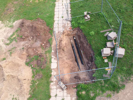 Heating system repair works. Trench and pipeline in park from drone, aerial