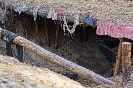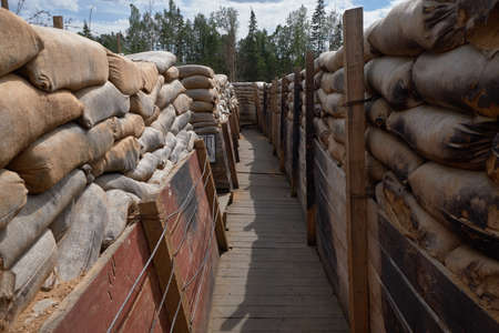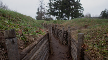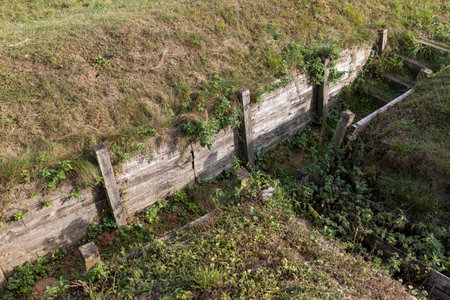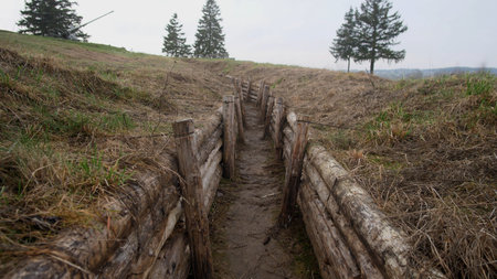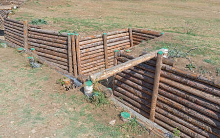an old abandoned military trench used for defensive actions, a trench dug in the ground sheathed with boards