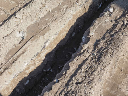a landslide with cracks in the soil, a close up of the crack inside the clay gorge, safe earth.