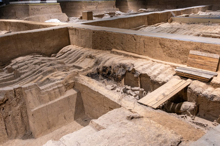Xian, China. Terracotta Army Warriors archaeological site. Partially excavated section. Undulating earth covers buried fragments