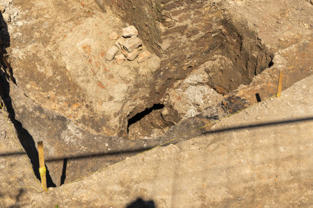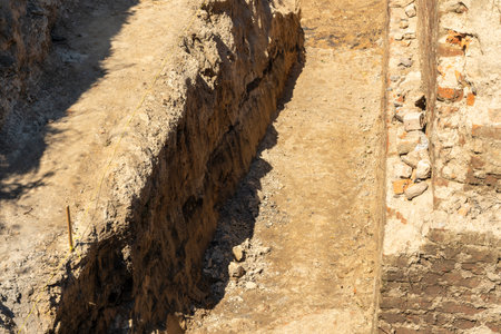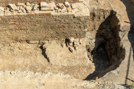 Historical Ruins Unearthed Archaeology Site. Urban Archaeological Excavation Showing Old Brick Wall Structure And Stratified Earth In Historical Research Project.