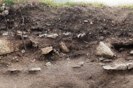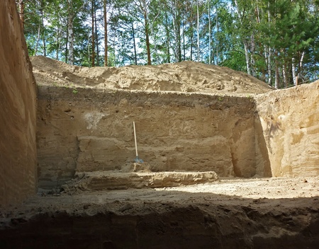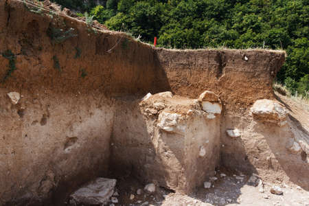 Archaeologists dug a hole on hillside to search for historical artifacts and finds. Archaeological work