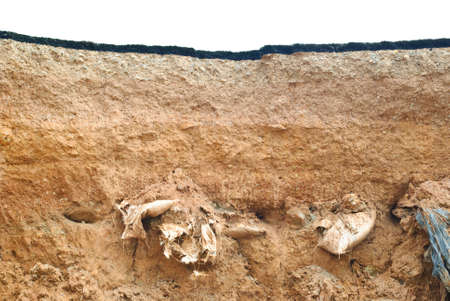 Top view of human remains in the ground. War crime scene. Site of a mass shooting of people. Human remains (bones of skeleton, skulls). Human remains of victims of the Nazis.
