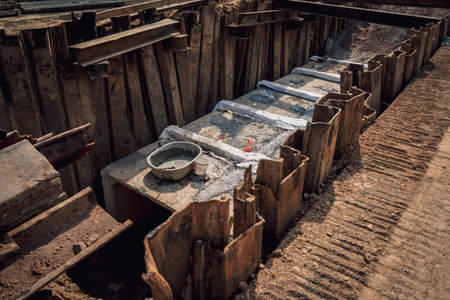 A trench is seen at a construction site with wooden supports. The dry earth reveals rich soil layers under a clear blue sky in the afternoon light.