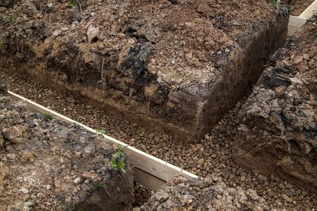 trench with rubble and formwork, which is prepared for pouring the foundation