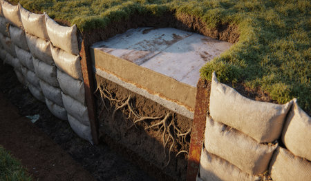 Construction site shows a soil barrier with concrete above and grass roots emerging from the ground in a garden setting.