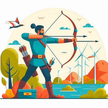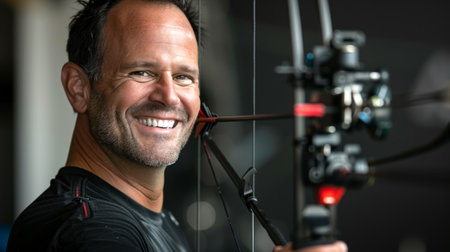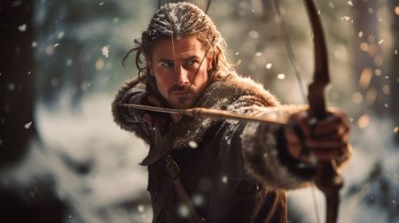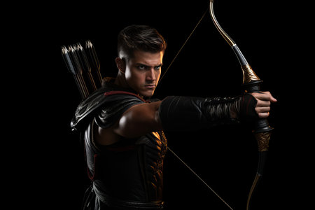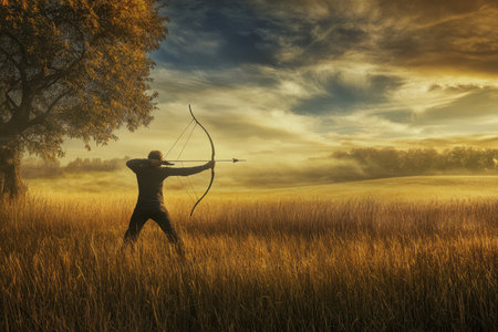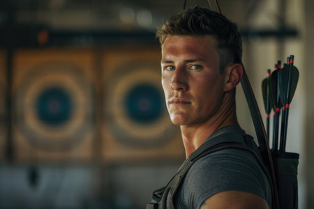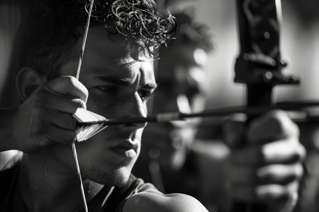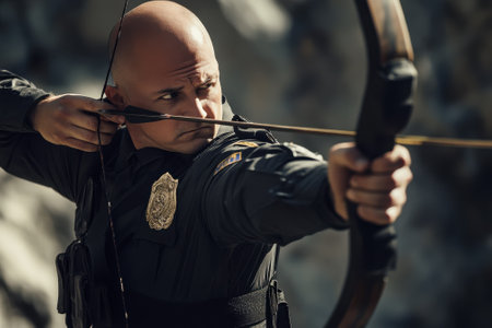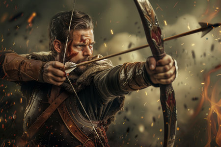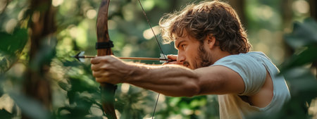 A focused man holds a bow and arrow, embodying precision and skill. His poised stance exudes determination as he aims for the target with intent.