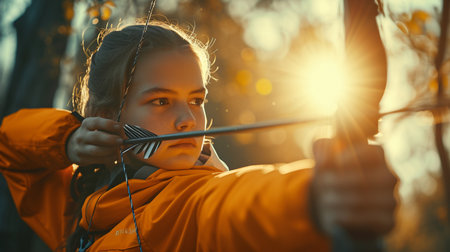Young archer focused on his target while hunting in the woods during autumn, showcasing determination and skill in his craft