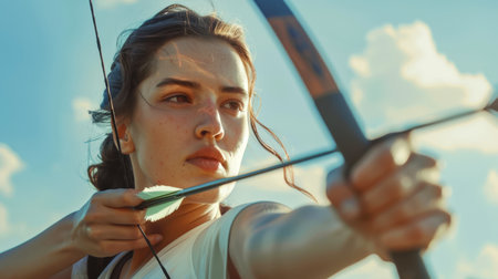 Archery competitions. A young woman holds a bow and arrow and is about to shoot. The concept of focus and determination when a woman prepares to shoot an arrow.