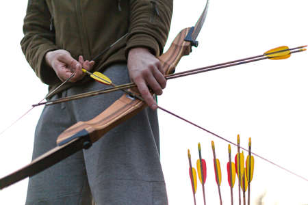 Archer close up, preparing the arrow for the shot, on white isolated background.