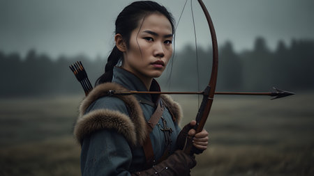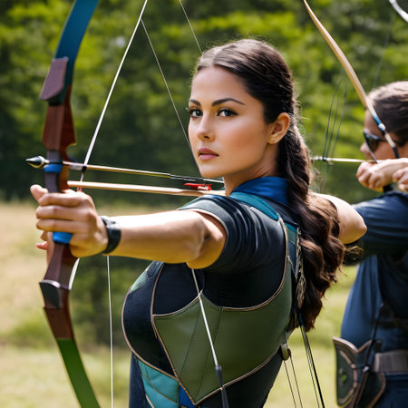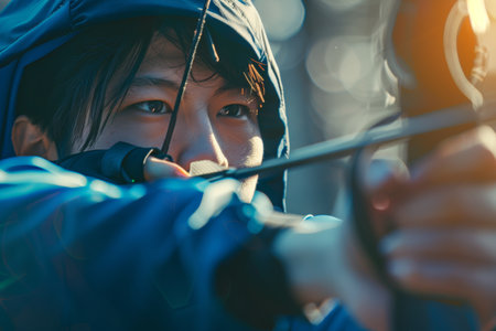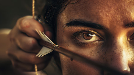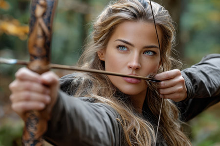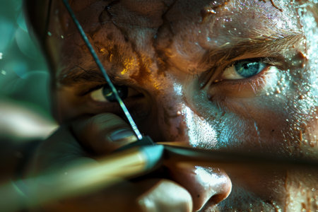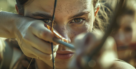 archer in the middle of a precise shot, concentration in their eyes generative ai
