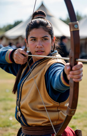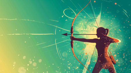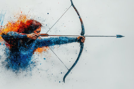 A talented archer draws back her bowstring, showcasing her focus and determination. Splashes of color surround her, blending artistry and skill. The backdrop creates a sense of movement and energy in the moment.