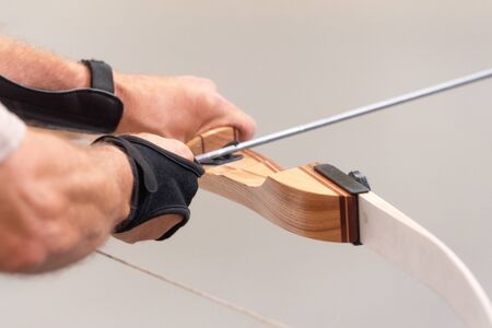 Archery. Man with a bow - close up view of a hands. Cropped image.