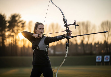 Archer focuses intently on the target as the sun sets, illuminating the tranquil field and trees.