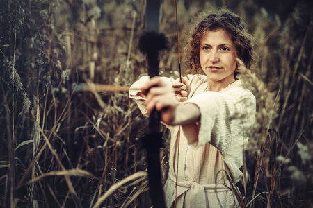 portrait of woman or girl archer with bow and arrow concentrated and aiming sunny summer outdoor on hay background