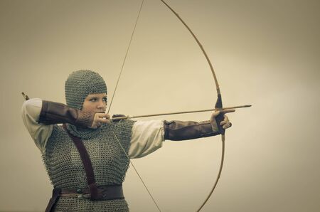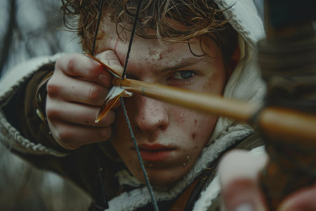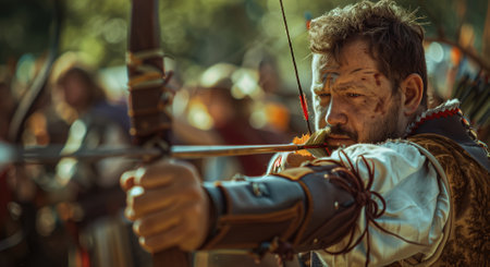 Man with focused expression aiming bow and arrow, dressed in medieval costume
