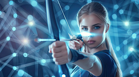 A woman with blue eyes focuses intently as she draws back an arrow, aiming into a background of digital light and network connections.
