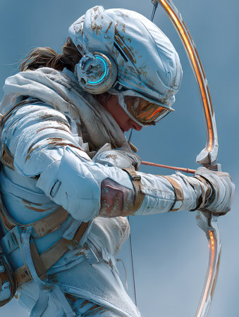 This image features a futuristic archer poised to shoot an arrow in a snowy landscape. The high-tech gear emphasizes adventure and performance in dynamic environments.