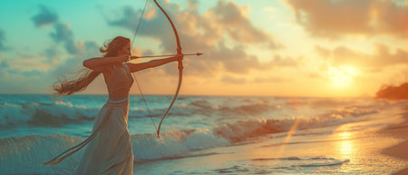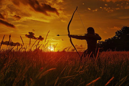 An archer stands in a field, pulling back a bowstring, with a vibrant sunset in the background.