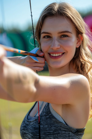 Caucasian female athlete prepares to shoot arrows at the archery range.