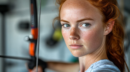 Focused Female Archer Takes Aim with Determination in Indoor Range, Professional Photography