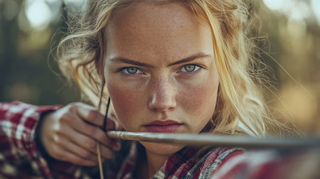 Intense Focus Young Female Archer Draws Bow, Aiming with Precision and Confidence in Nature