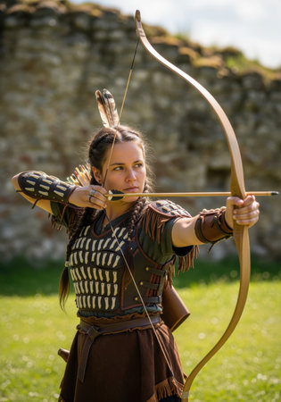Female archer dressed in ancient warrior armor aiming arrow at target outdoors with focused expression and historical costume details.