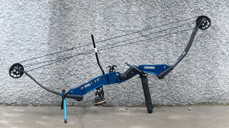 Hand of an archer with a block bow close up.