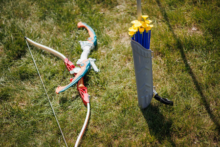 Colorful archery equipment laid out on green grass on a sunny day
