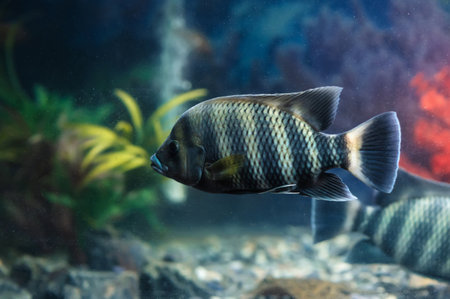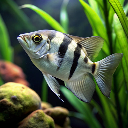 Elegant striped freshwater fish swimming gracefully through crystal clear aquarium water against artistic background blur, showcasing natural behaviors in carefully maintained home habitat setting