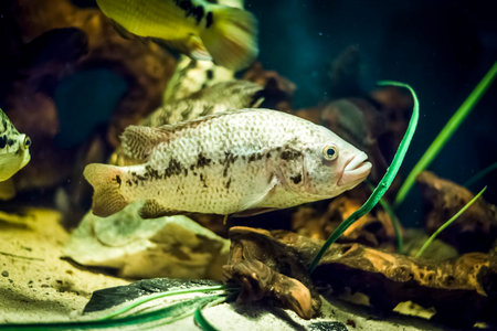 Colorful close-up of a spotted fish swimming among rich aquatic vegetation, showcasing intricate scale patterns and fins. captures the serene beauty of underwater ecosystems and the vibrant life within them. Generative AI