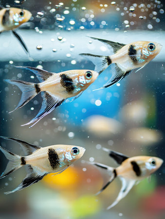A stunning close-up of graceful tropical fish swimming in clear aquarium water, showcasing their vibrant colors and elegant movements in a lively aquatic habitat.