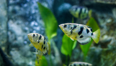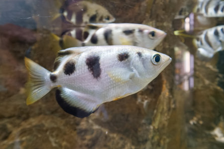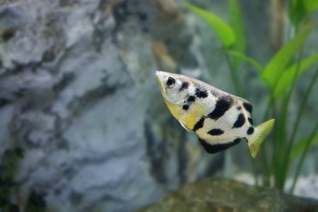 Close-up of a fresh Siamese Archerfish in Aquarium. Archerfish (Toxotes siamensis) with distinctive black and yellow spots swimming in aquarium with blurred rock and aquatic plants