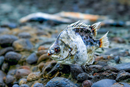 A poignant image of a small, dried fish lying on the rocky shore of Houlong Longgang, Miaoli, Taiwan, symbolizing the delicate balance of coastal ecosystems.