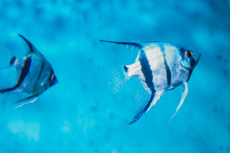 Tropical fish Pterophyllum scalare altum swimming in aquarium blue water. Tropical striped silver black fishes in oceanarium pool