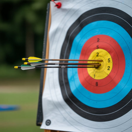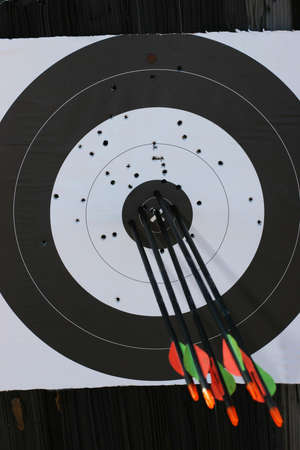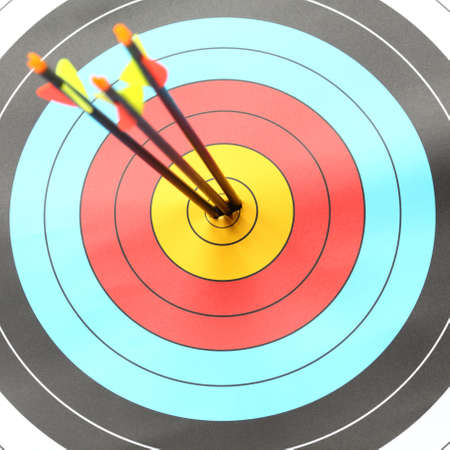 Archery arrows hitting the center of a target, close-up