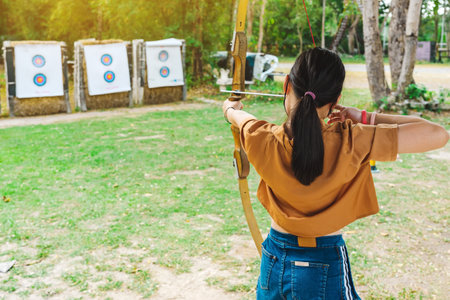 Back view of Asian girl wear face mask aims archery bow and arrow to colorful target in shooting range during training and competition. Exercise and concentration with outdoor archery.Archery for teen